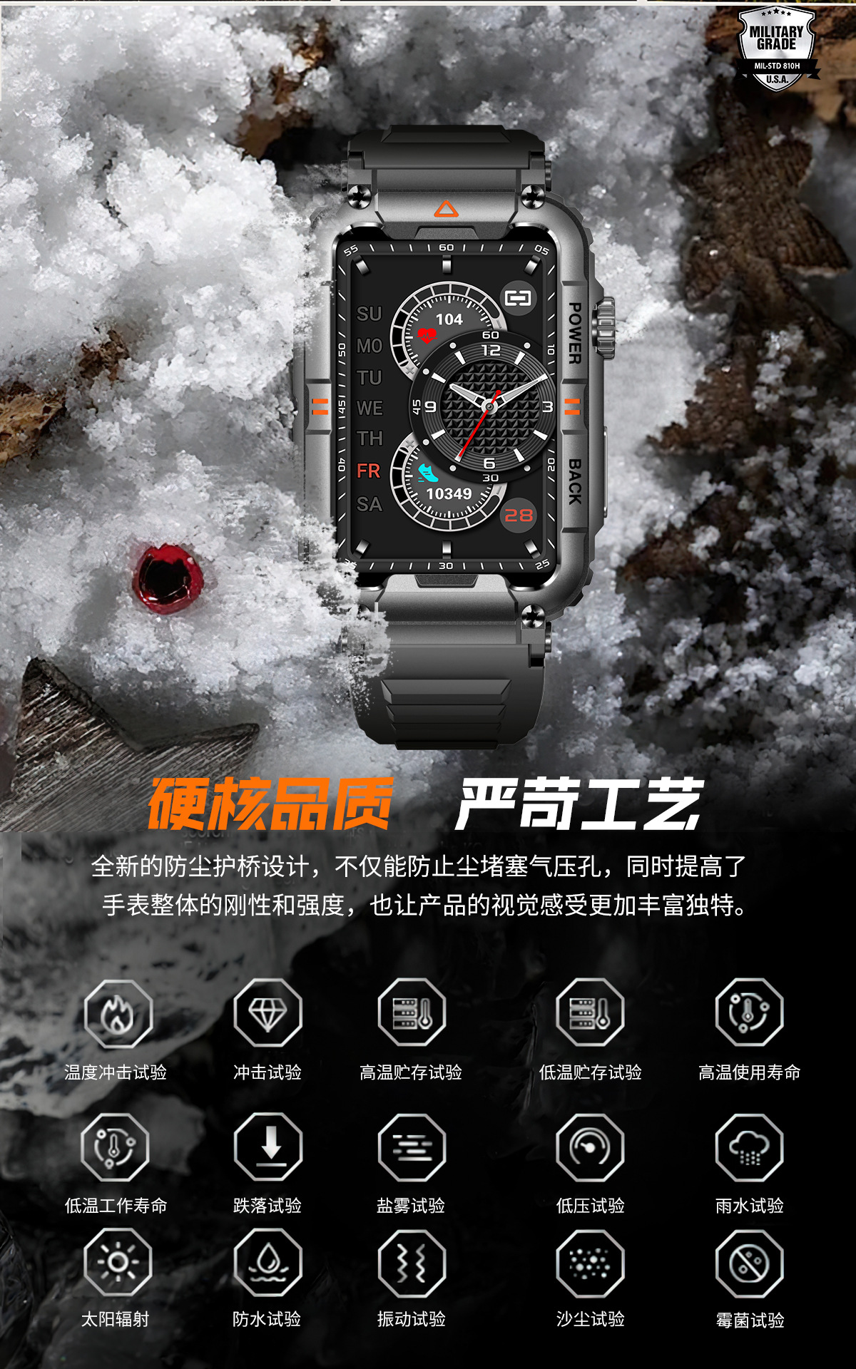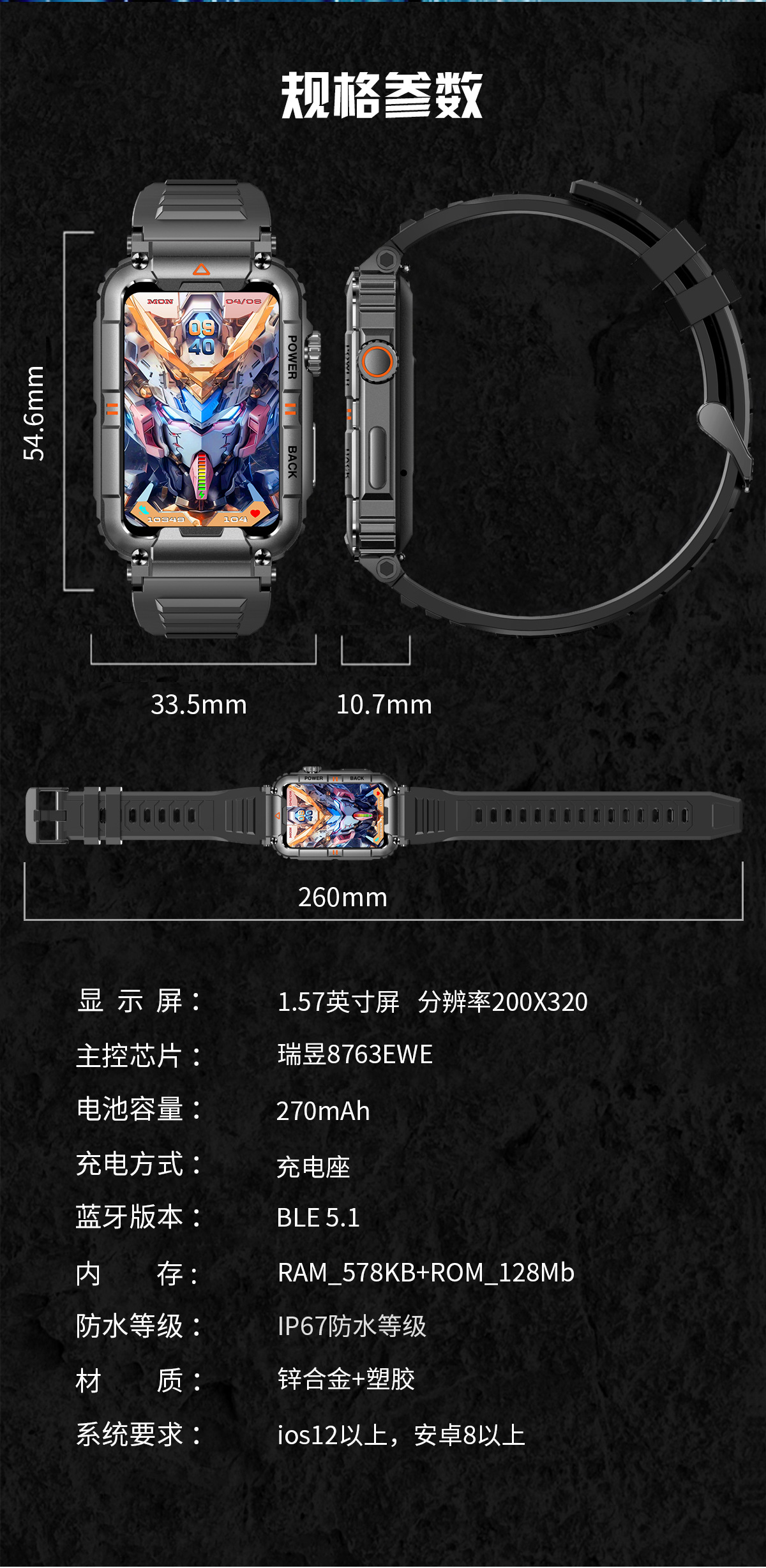 Functions: heart rate monitoring, blood pressure measurement, social entertainment, smart reminder, remote control selfie, sleep monitoring, blood oxygen detection